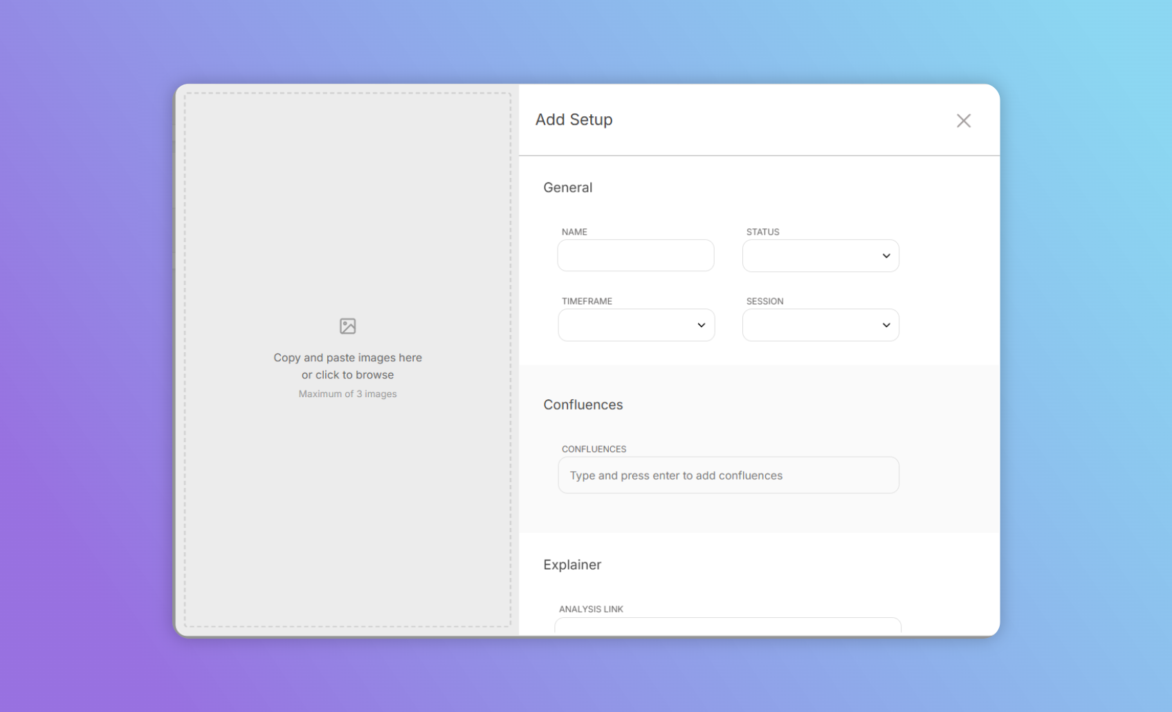 Setup → Confluences → Trade → Resultaat → Analyse